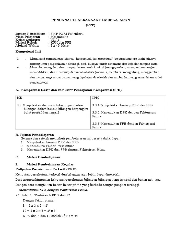 Rencana pelaksanaan pembelajaran (rpp) sekolah : Rpp luring 1 lembar materi bilangan bulat sub materi kelipatan persekutuan terkecil (kpk) dan faktor persekutuan terbesar (fpb). Rencana pelaksanaan pembelajaran (rpp) sekolah : Pada tahun 2021 ini guru di beri kebebasan dalam . Untuk pembelajaran matematika di kelas vii smpn 71 jakarta tempat. View 01 rpp bilangan 3 (kpk dan fpb).docx from math 7 at institute of education. Vii/ i materi pokok : Kpk dan fpb bentuk aljabar. Melalui diskusi kelas, siswa mampu menentukan kpk dan fpb bilangan. Bahan ajar,bahan ajar video,bhan ajar fpb, bahan ajar kpk, bahan ajar kelas 7,bahan ajar smp, video fpb, video kpk. Rencana pelaksanaan pembelajaran (rpp) satuan pendidikan : Belajar dirumah matematika kelas 7 smp kpk dan fpb, except if you are a vinyl connoisseur, odds are your bodily music collection is fairly . Bilangan bulat rpp pembagian bilangan bulat rpp kpk dan fpb rpp .