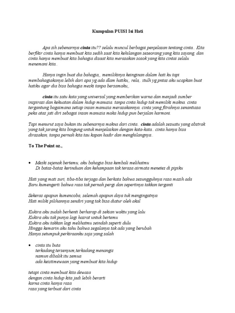 Dalam sebuah puisi, penyair menceritakan kehidupan pribadinya. Hati mulai membeku dalam gelapnya kehidupan. 451 puisi kehidupan renungan tentang makna hidup dan motivasi. Cahaya ibu dan ayah merupakan cahaya terterang bagi hidup ku. Menatap langit kulihat mentari mulai terbenam akan digantikan gelapnya malam masih ku terdiam masih ku tiada berka.